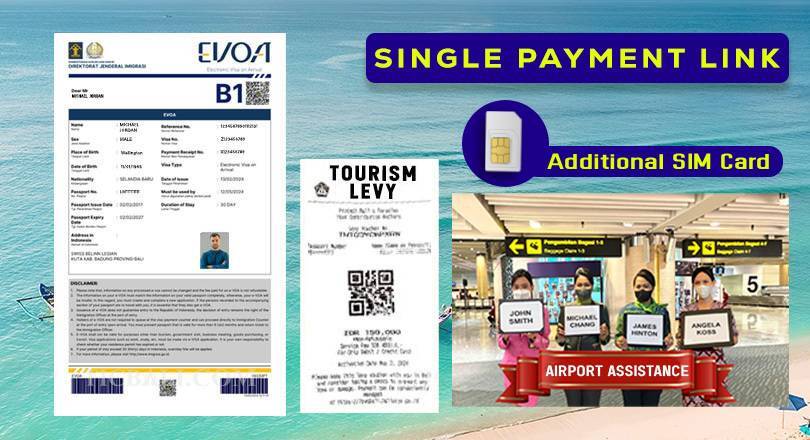 Upon successful eVOA registration, TICBALI will provide payment links from "Immigration website IDR 500,000 per passport" And payment link from Ticbali website for "(eVOA Document Submission Assistance IDR 150,000 + Tourism Levy IDR 150,000 + Tourism Levy Registration fee IDR 50,000 = IDR 350,000) per passport"